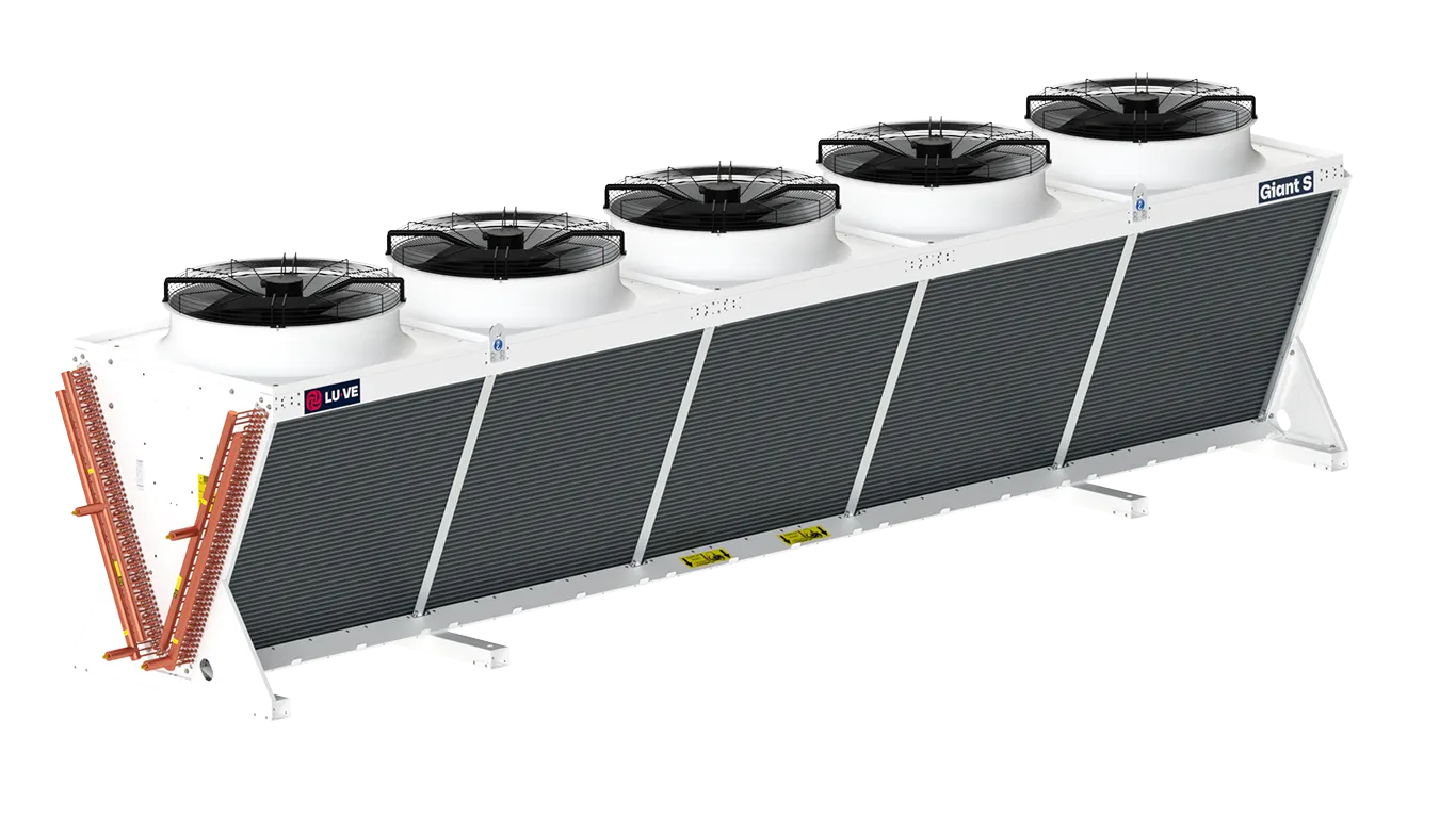 CO2 gas coolers replace traditional air cooled condensers in refrigerating systems that have been designed for the use of CO2 as a single refrigerant. Such installations are getting more and more widely used in f.i. commercial supermarket applications. Giant S UXV-TS has been specifically designed for commercial refrigeration and air conditioning. The V-angle with its exceptional guiding optimizes airflow and low coil resistance reduces energy consumption of the fan motors. Its main purpose is to reject small to medium heat loads in a modest footprint.